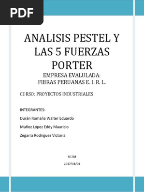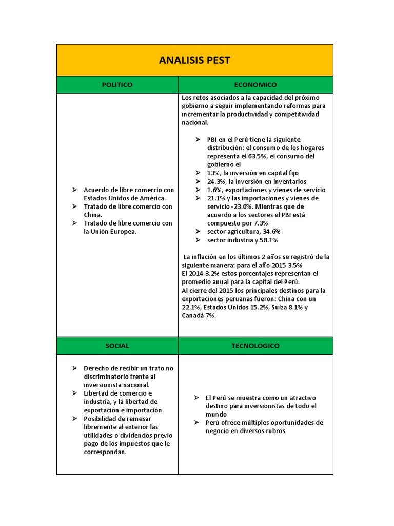 Está ubicado en la costa peruana a 530 km al sur de lima. El origen del análisis pest se remonta a 1968 con la publicación de un ensayo sobre marketing por el contrario, el análisis pest se centra en el contexto del proyecto o empresa. El análisis pestel es una herramienta de identificación de factores del entorno que podrán afectar a nuestro futuro negocio, o igualmente, puede que nuestro negocio esté afectado por las infraestructuras generales de una cierta zona. Políticos, económicos, socioculturales y tecnológicos. El objetivo es determinar el tipo y características fundamentales de la firma: Proyecto analisis pest empresa pintuco. 05/04/2011 analisis pest en el perú la creciente demanda de viviendas en el perú a ubicado a nuestro país en una de las zonas con mayor auge en la industria de la constitución. Con el análisis pest comprendes el entorno empresarial sobre el que se mueve una empresa. La empresa cuenta con diferentes productos que se amoldan a las necesidades de los. A continuación, desarrollaremos un análisis foda de una empresa textil del país. Evaluación de los elementos internos de la empresa recursos y capacidades y externo para identificar y diagnosticar las amenzas y oportunidades del entorno, las fortalezas y debilidades de la propia empresa. Estas son las variables principales que pueden afectar y modificar el entorno de una empresa y de sus. Analisis de pest by luis león garcia 81518 views.