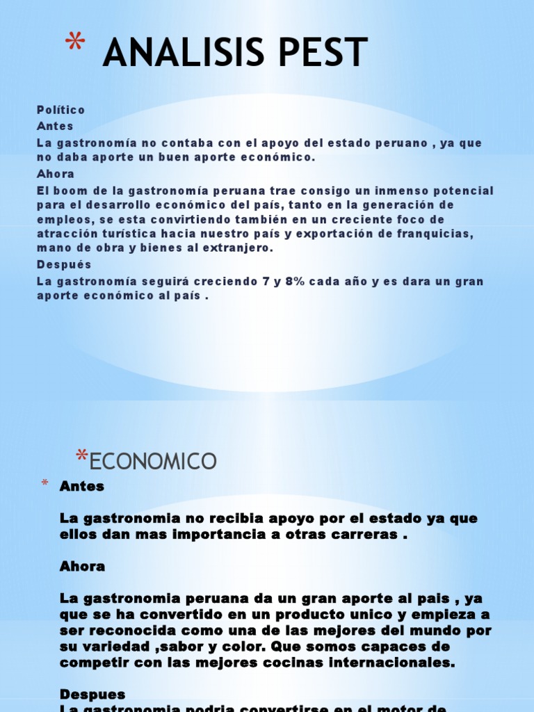 Tradicionalmente, el análisis del entorno general se limitaba al análisis de la coyuntura económica del país o la región donde se la creciente importancia de las dimensiones socioculturales y tecnológicas amplió el estudio del entorno general de una empresa. •el producto se encuentra realizado con materiales propios de argentina. Analisis de pest by luis león garcia 81518 views. La empresa cuenta con diferentes productos que se amoldan a las necesidades de los. Shoungang hierro peru sa la empresa se constituy en febrero de 1952.
