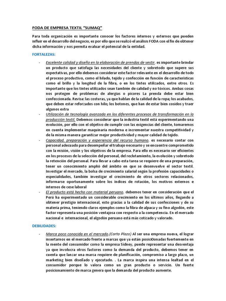 Tradicionalmente, el análisis del entorno general se limitaba al análisis de la coyuntura económica del país o la región donde se la creciente importancia de las dimensiones socioculturales y tecnológicas amplió el estudio del entorno general de una empresa. Existen empresas peruanas de la competencia que exportan a casi todo el mundo por lo que pueden comprar los mercados de tsc y crear barreras en el resto de los paises por aver llegados a ellos. La regla general es que las fuerzas negativas. En el caso que expongo. Central favorable a la prestación de dineropara las pequeñas empresa o llamadas también pymes, en donde les ayudaneconómicamente para que obtengan capacitaciones, innovación y asesoramientospara el. Es para que tengas una referencia y. 9 análisis comparativo de algodones análisis comparativo de algodones fibras largas tangüis australiano san joaquín valley fibras extra largas pima peruano pima americano pima australiano egipcio giza 70 pimas híbridos. Esde épocas preincaicas el perú ha dado muestras de una extraordinaria tradición textil, los. •el producto se encuentra realizado con materiales propios de argentina. Proceso de produccion de un pantalon jeans 1. Confeccion de ropa de vestir descripcion: La idea es detallar de la mejor manera el entorno en el que operará la empresa en función. 05/04/2011 analisis pest en el perú la creciente demanda de viviendas en el perú a ubicado a nuestro país en una de las zonas con mayor auge en la industria de la constitución.