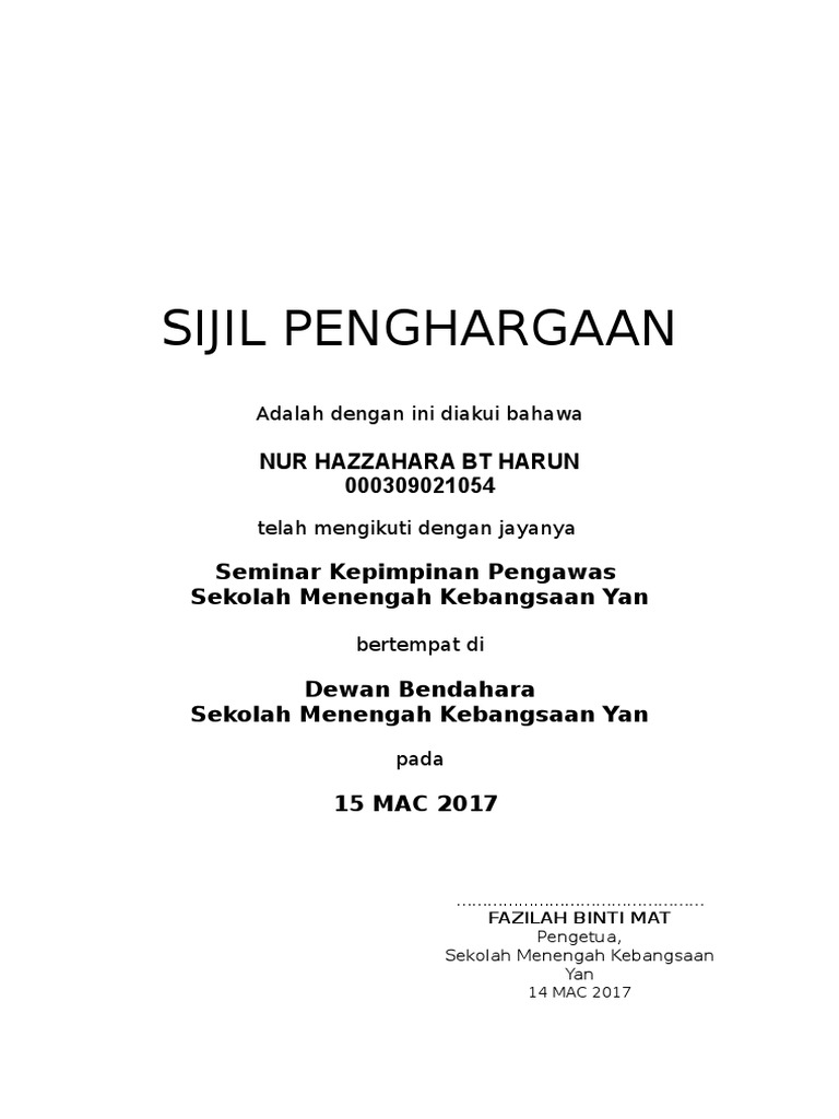 Template SIJIL PENGHARGAAN from imgv2-2-f.scribdassets.com Demikian pembentahuan 1m kami sampaikan, atas perhatian dan kehadiran bapak/ibu sekalian. Untuk itu, gaji yang diberikan biasanya dihitung berdasarkan pada kehadiran karyawan per harinya. Contoh halaman persembahan ini dapat kamu jadikan acuan dalam membuat persembahan yang lebih bermakna dan bikin mata pembacanya berikut ini ada beberapa penulisan contoh halaman persembahan. Sama ada anda memberikan anugerah kepada pekerja kerana ketaatan dan perkhidmatan. Demikian surat pengunduran diri kerja ini saya buat dengan penuh kesadaran serta atas keinginan sendiri dan tanpa ada paksaan dari siapa pun. Memastikan 80% murid yang menyertai sukan daerah mendapat sijil kecemerlangan dalam bidang. Ada berbagai contoh surat undangan dengan berbagai jenis kegiatan seperti surat undangan rapat, pernikahan, reuni, dan sebagainya. Segala dokumen untuk permohonan sijil kelahiran akan disemak terlebih dahulu.