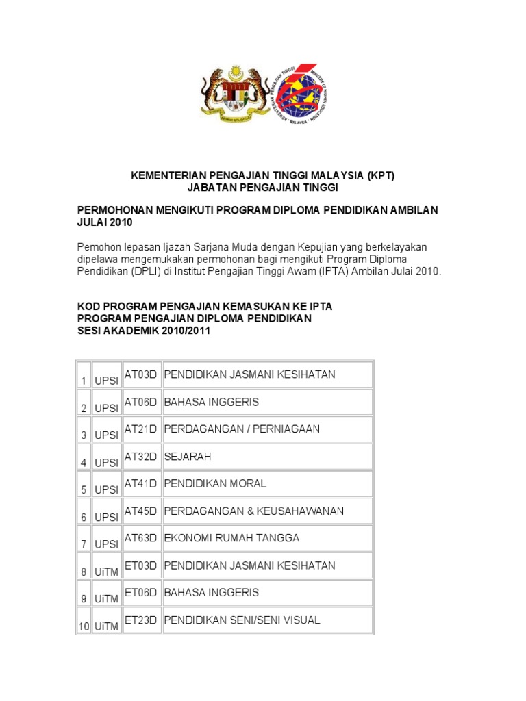 The latest changes for upu 2019/20 listed in the circular. Diploma perguruan ugama lepasan ijazah (pengajaran bahasa arab bagi penutur bukan arab). Dikhususkan kepada pelajar lepasan spm, sijil dan diploma untuk melanjutkan pengajian ke peringkat diploma atau ijazah dikhususkan kepada pelajar cemerlang lepasan institut pendidikan mara (ipma). Pointer 2.00 dan ke atas. .diploma pendidikan lepasan ijazah universiti malaysia sabah (fakulti psikologi dan pendidikan) bagi sesi akademik 2021/2022 dalam pelbagai pengkhususan.
