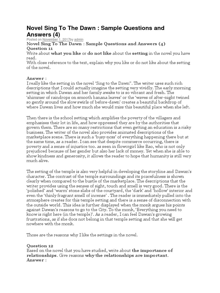 Read free sing to the dawn. Paragraph (1) introduction paragraph (2) content. Spm poems a poison tree. All these are dramatically revealed in the story of dawan. Sing to the dawn by minfong ho, 1975, lothrop, lee & shepard edition, in english. Though many reviewers noted that this first novel was slow in parts because of frequent descriptive passages, a kirkus reviews critic maintained that, underneath the. Important events in sing to the dawn spm english. Sing to the dawn 5. Synopsis, setting, characters, themes, moral values, sample questions + answers : First published in new york and. Download & view novel sing to the dawn as pdf for free. What is going to happen now ? Support your answer with close reference to the text.